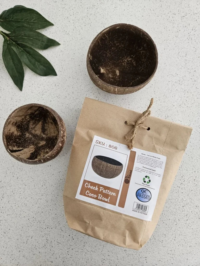 Our check pattern coconut bowl is made of coconut shells. Coconut bowls are made by cleaning and polishing coconut shells to create a smooth surface. The bowls can be used to serve food or as decorative items. They can also be added to your children’s home corner area for them to explore imaginative play.